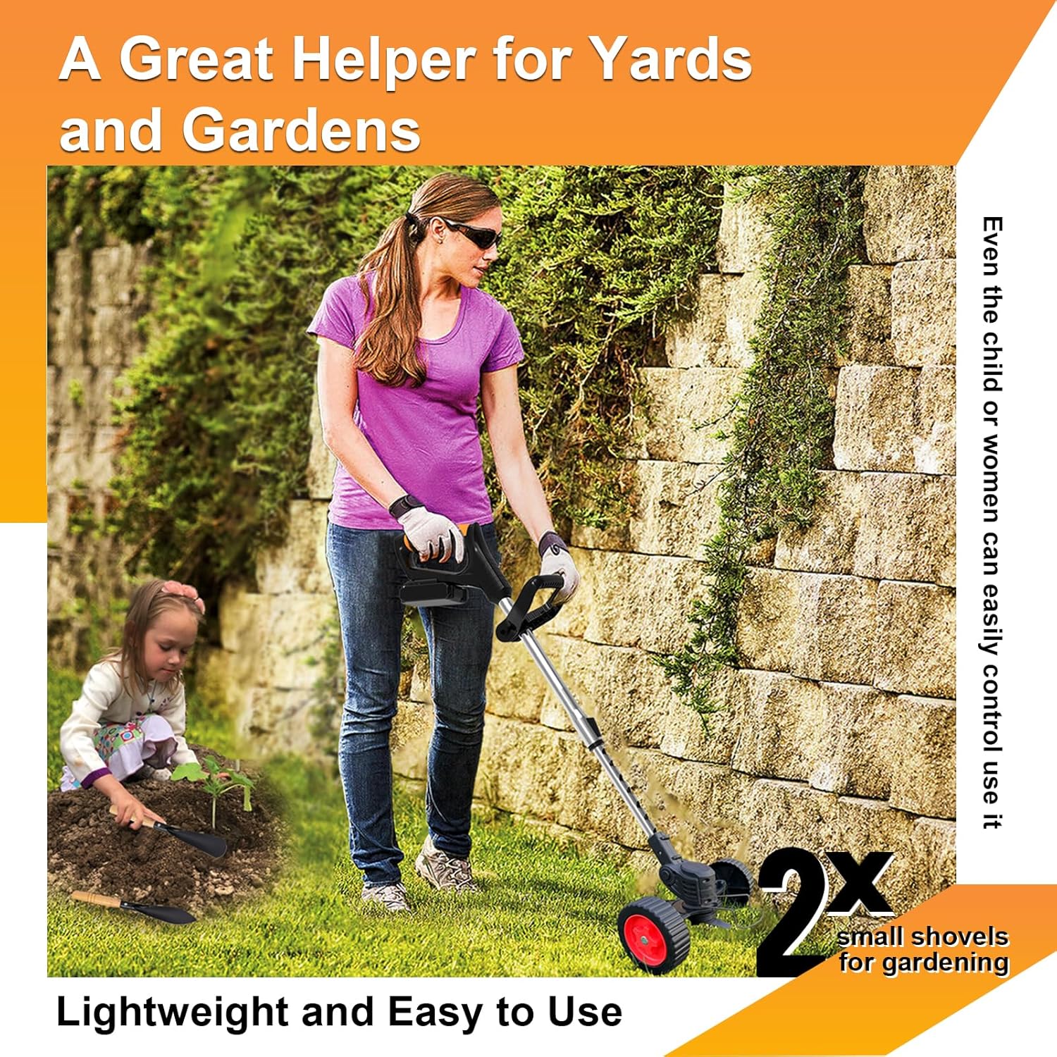 - 【2025 New Upgraded Electric Weed Trimmer】 Our cordless weed wacker has passed the professional design and safety test. The cordless grass trimmer has been upgraded with smoother wheels, higher-strength blades and larger-capacity batteries. We have completely solved the problems of the old string trimmer, such as wheels failing to turn, blade breakage and short cutting time. Two modes (wheel on/wheel off) can be switched freely, allowing you to mow your garden and yard lawn more easily