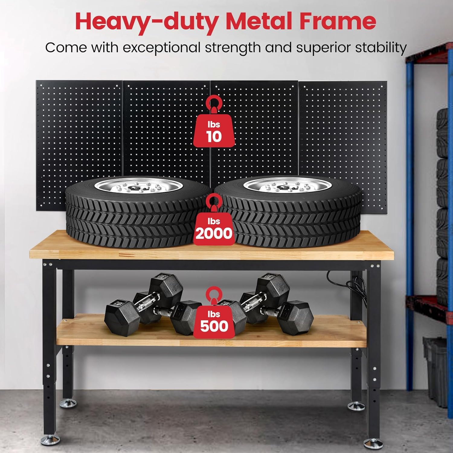 Work Table for Garage 60 x 22 Inch Adjustable Height Workbench Heavy Duty Rubberwood Tabletop Work Bench with Power Outlets Pegboard Pad for Woodworking Shop, Home, Office