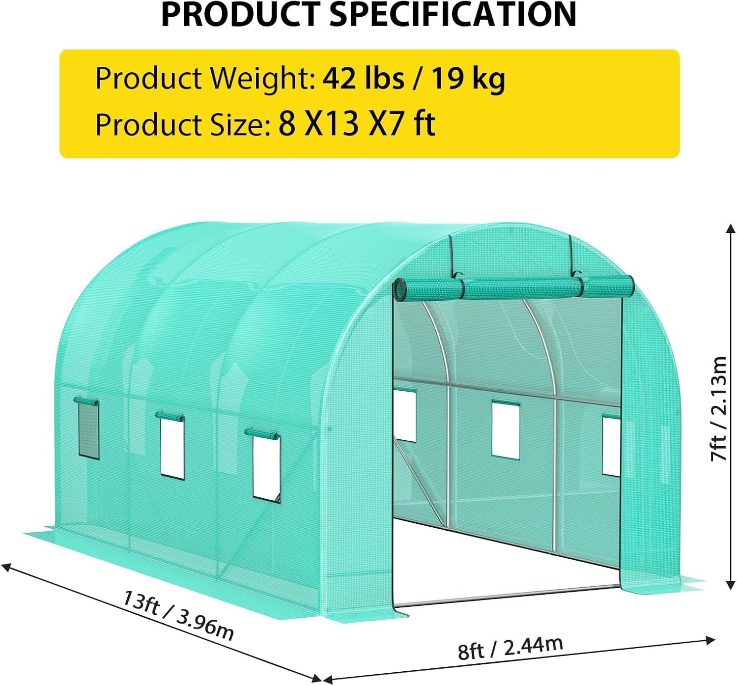 Compact Greenhouse Kit 8'x13'x7' with Galvanized Frame, 140G Green PE Cover, 2 Doors & 6 Windows for Outdoor Gardening