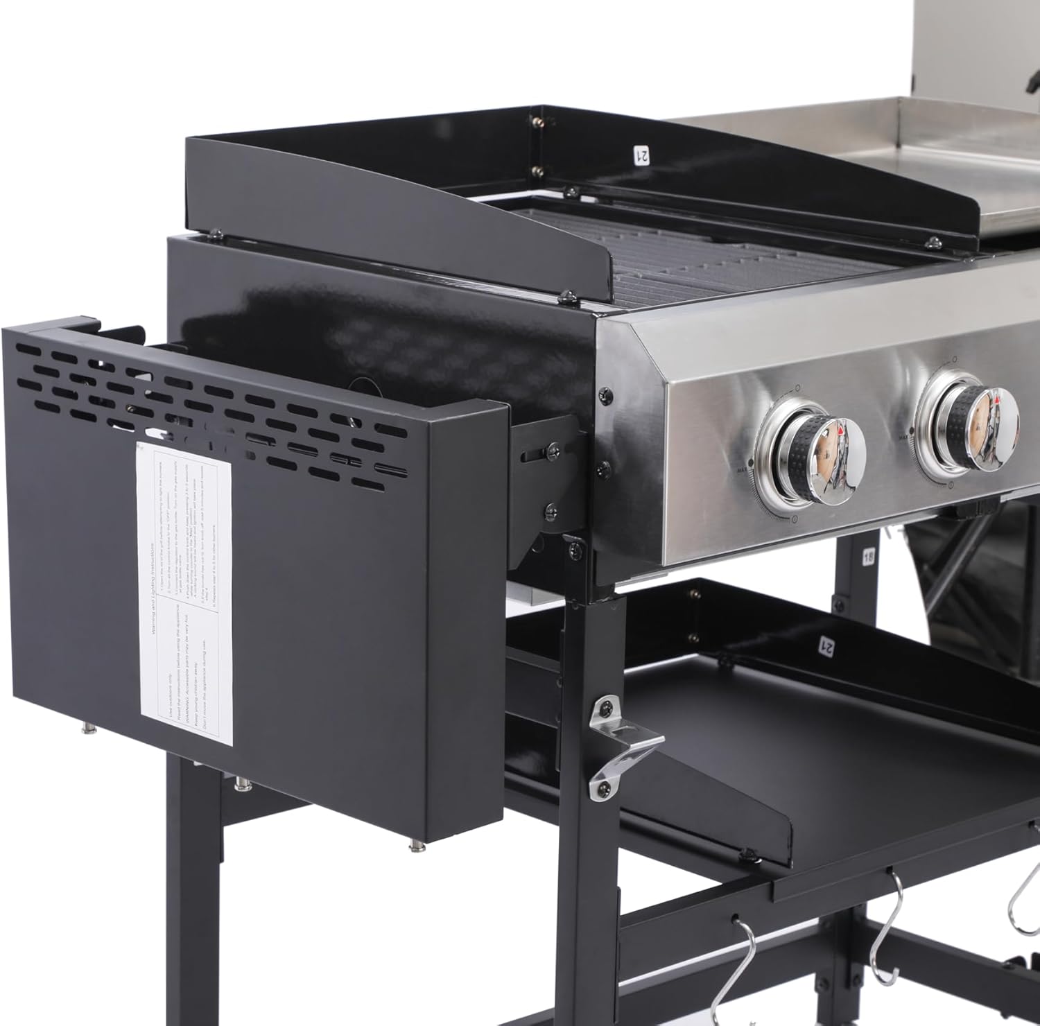 4-Burner Propane Gas BBQ Grill with SS Plancha, 38,200 BTU Output, Wire Enamel Cooking Grids, Foldable Side Table and Hanging Basket, Heavy-Duty Stainless Steel Grill