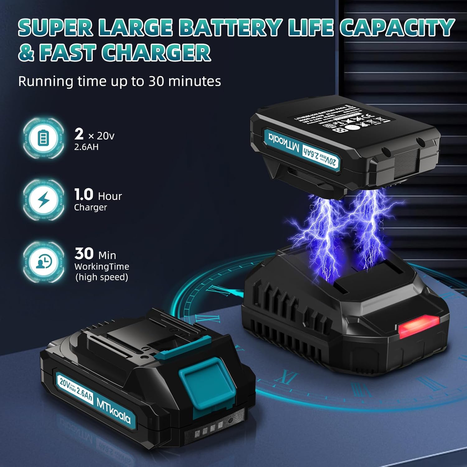 - 【Significant Highlights of MTK】Upgrade Powerful Motor& High Battery Capacity 2*2.6Ah & Fast Charger&Quiet and Lightweight Design,up to 450 CFM and150 MPH,effectively improving air volume and wind power. It can operate continuously for 30-35 minutes,outperforming 99% of sellers on the market who offer a battery life of 10&20 minutes, you can take care of your garden and backyard more efficiently,which is far beyond the market 2.0 Ah, sufficient battery capacity can help you work efficiently.