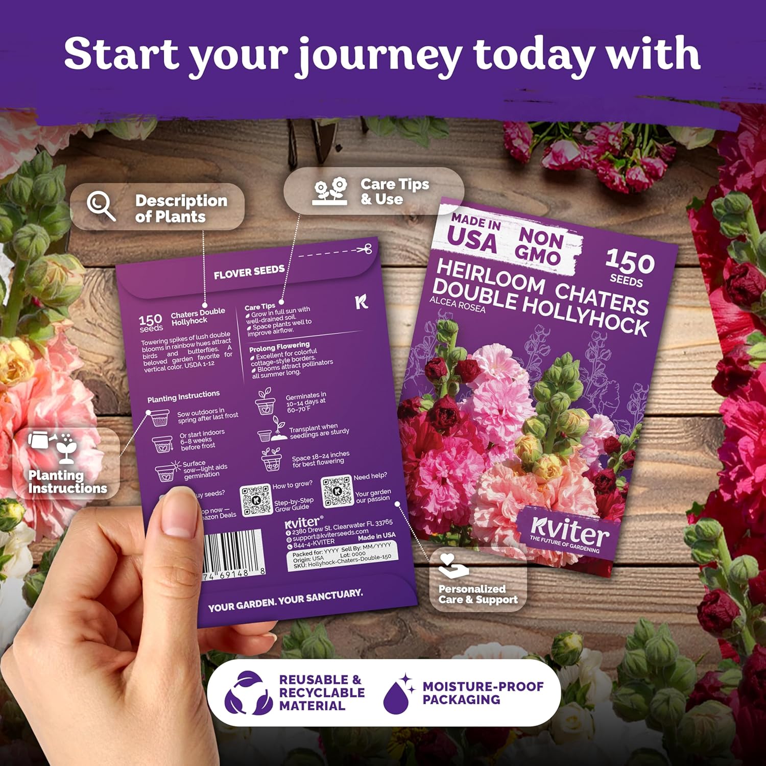 KVITER 150 Chaters Hollyhock Seeds for Planting (Alcea rosea) - Heirloom | Tall Blooms | Pollinator Magnet - Double Hollyhocks Flower Seeds to Plant Outside in Garden, Cottage Borders, Containers