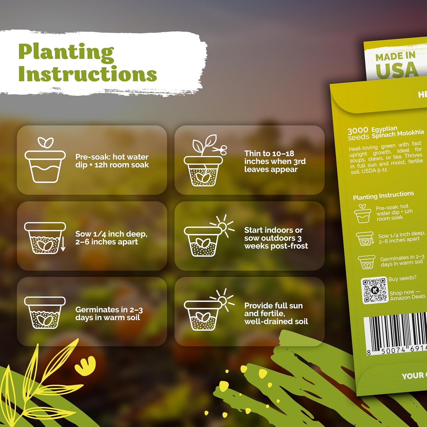 - Heat-Loving Leafy Green: Grow these egyptian spinach seeds for tender greens. At 24–36 inches, each plant thrives in 65–80°F, ideal for a home garden or indoor vegetable garden.
