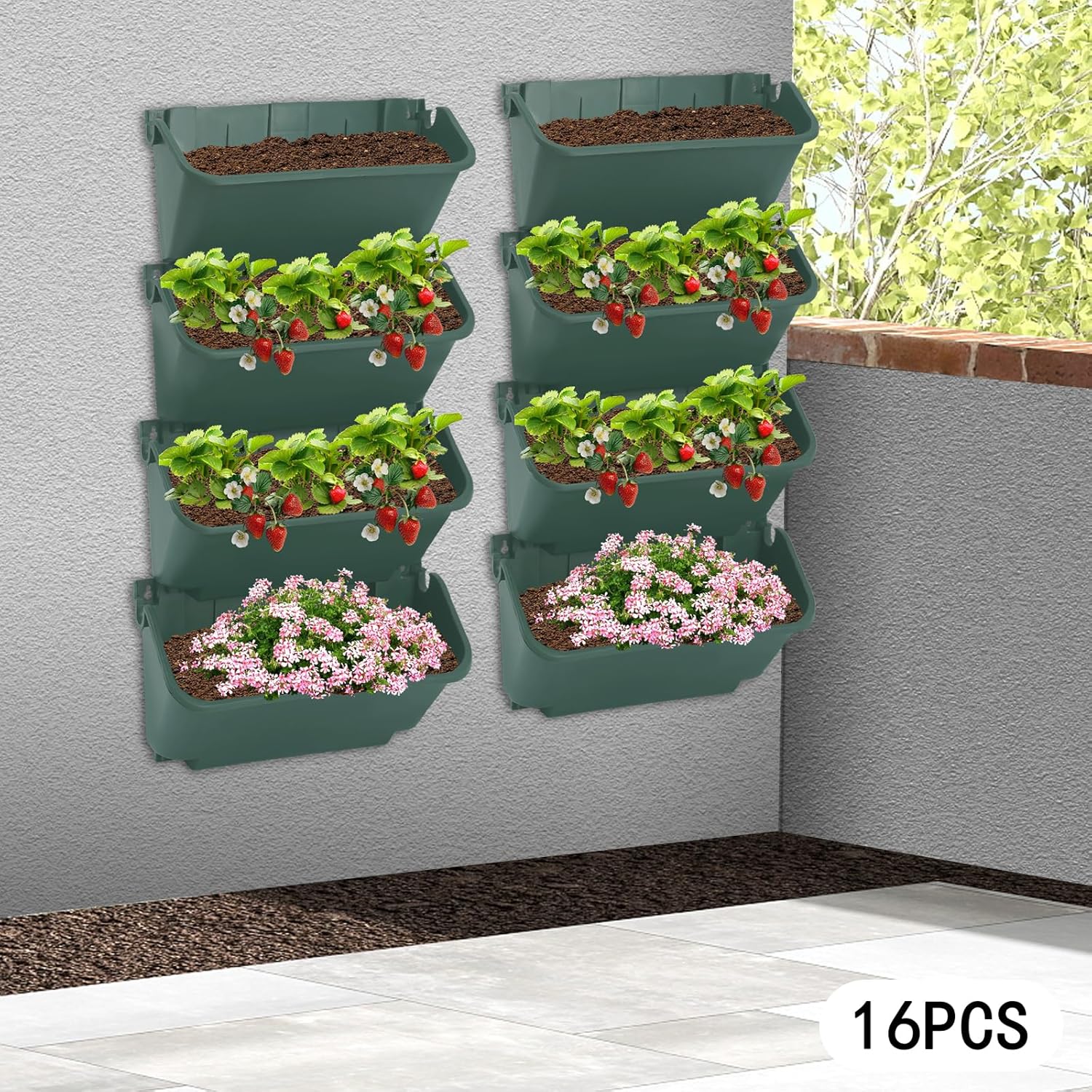 16 Pack Self Watering Wall Mounted Planter, Indoor and Outdoor Vertical Planter Wall Mounted Planter for Patio Outdoor Decor with Drainage Holes, Vertical Garden Planters for Indoor Plants- Green
