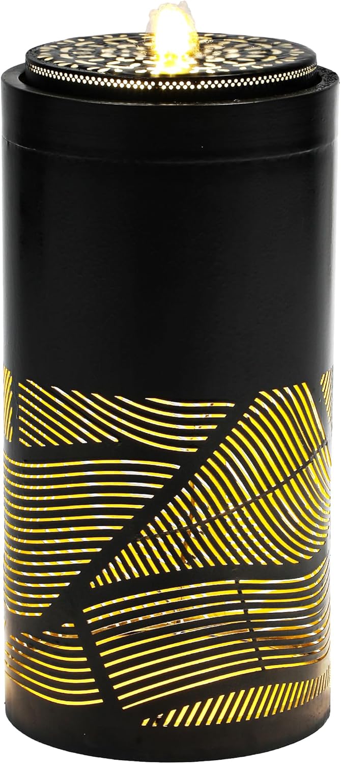 - [Artistic Laser-Cut Design]:This fountain is more than just a decoration—it’s a statement piece. The finely laser-cut geometric metal panel casts captivating light and shadows during the day. At night, illuminated by warm LEDs, the flowing water sparkles brilliantly, making it a stunning visual centerpiece for your garden, patio, or yard.