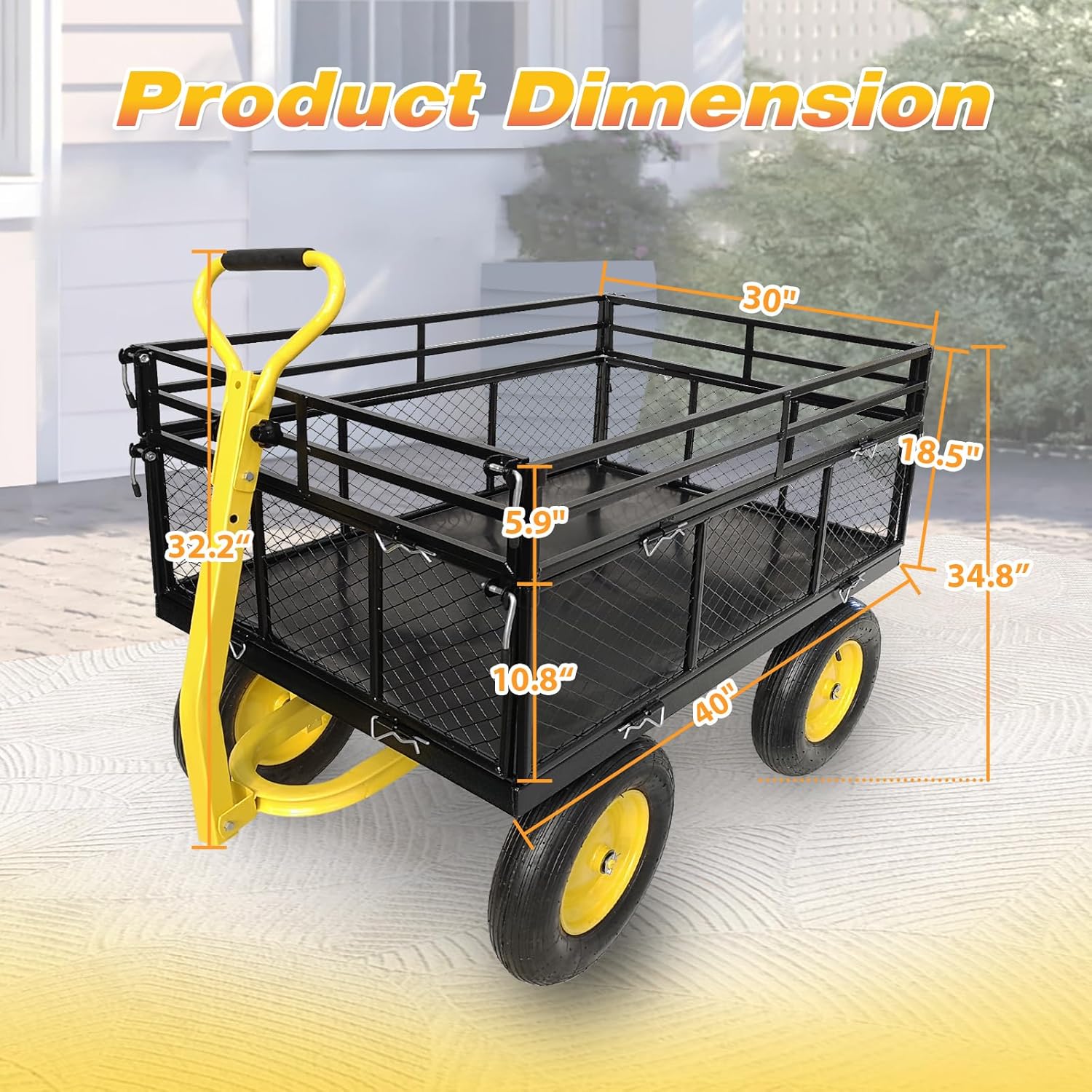 Steel Garden Cart On Wheels, 1400 Lbs Capacity, 2-in-1 Handle and 16 in Tires, Heavy Duty Wagon Cart with Removable Mesh Sides to Convert Into Flatbed