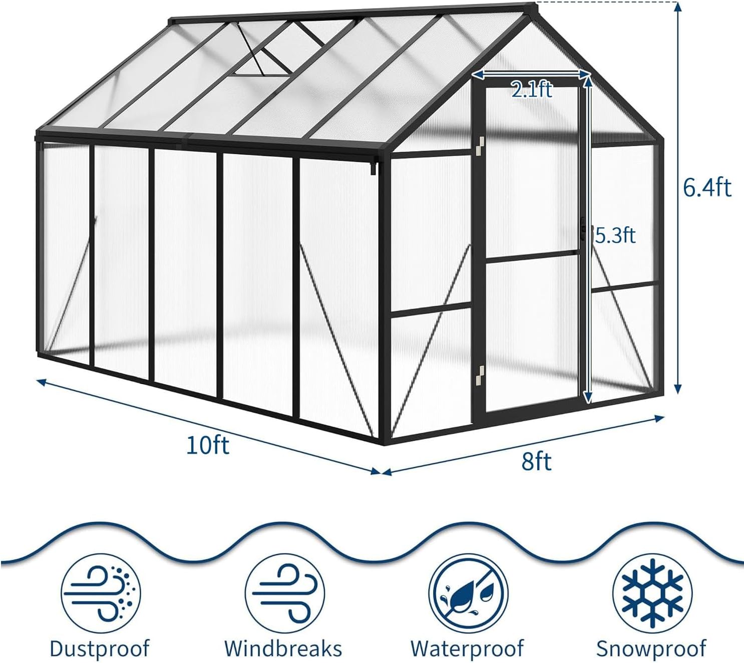 - Superior ventilation and spacious layout define this thoughtfully designed structure. Dual roof vents and a wide lockable door promote exceptional air circulation, while the generous 8x10FT interior accommodates multiple planting tiers, hanging baskets, and shelving units. This green houses for outside offers both vertical and horizontal space optimization for cultivating everything from seedlings to mature crops.