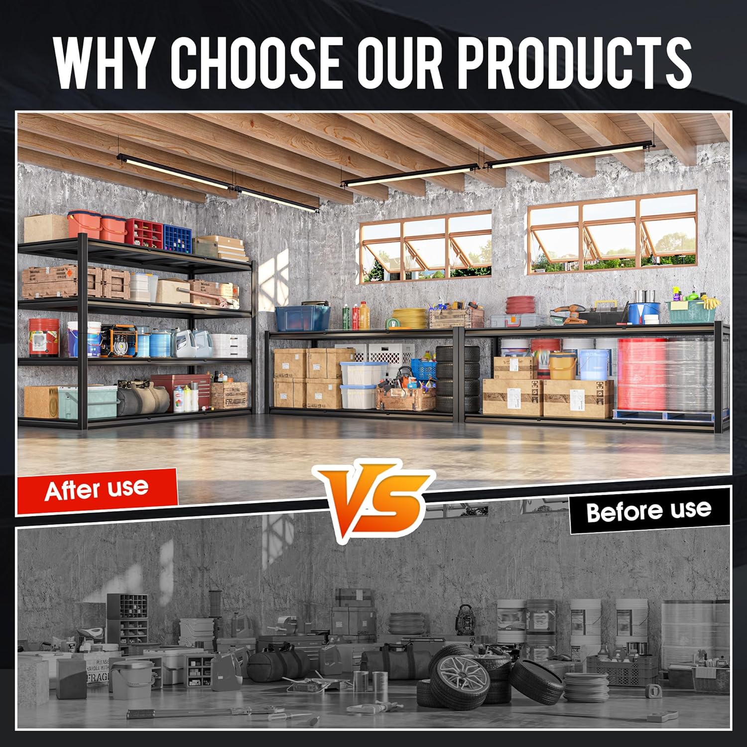 - 【Ultra-Safe Industrial-grade Load-bearing System】 Made of commercial-grade cold-rolled steel and reinforced structure, The garage shelving is specially designed for heavy-duty warehouses. The specially designed powder coating on the surface not only prevents rust and scratches but also makes it easy to clean. It is equipped with a professional anti-tipping kit as standard, ensuring absolute stability. This is not merely a tool, but a lifelong investment you plan for your garage